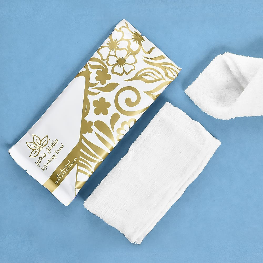 تم تصميم عبوّة المنشفة في قالبٍ لطيف باللونين الأبيض والذهبيّ.